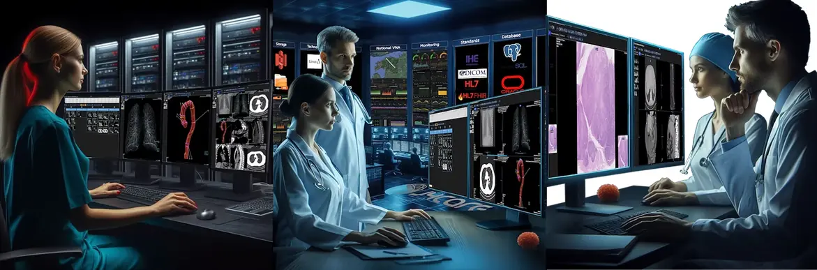 Conformidade com normas DICOM, HL7 e IHE. Integração com RIS (Radiology Information System), EHRs e nuvem. Compatibilidade com equipamentos de diferentes fabricantes. API RESTful para desenvolvedores.
